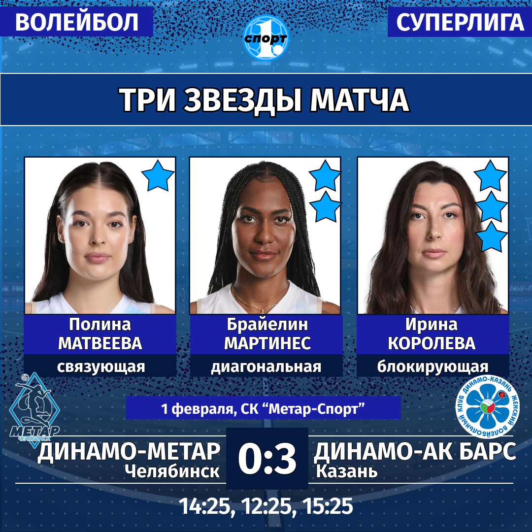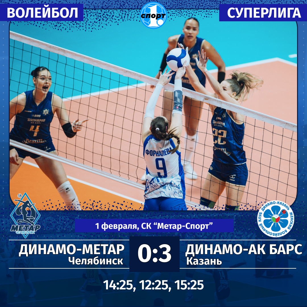 Женская волейбольная команда «Динамо-Метар» потерпела поражение от лидера Суперлиги. Сегодня, 1 февраля, челябинки уступили с «сухим» счетом казанскому «Динамо-Ак Барсу». Хозяйки площадки не смогли преподнести подарок на День рождения гендиректору клуба Виталию Носову, которому сегодня исполнилось 58 лет, сообщает корреспондент ИА «Первое областное».