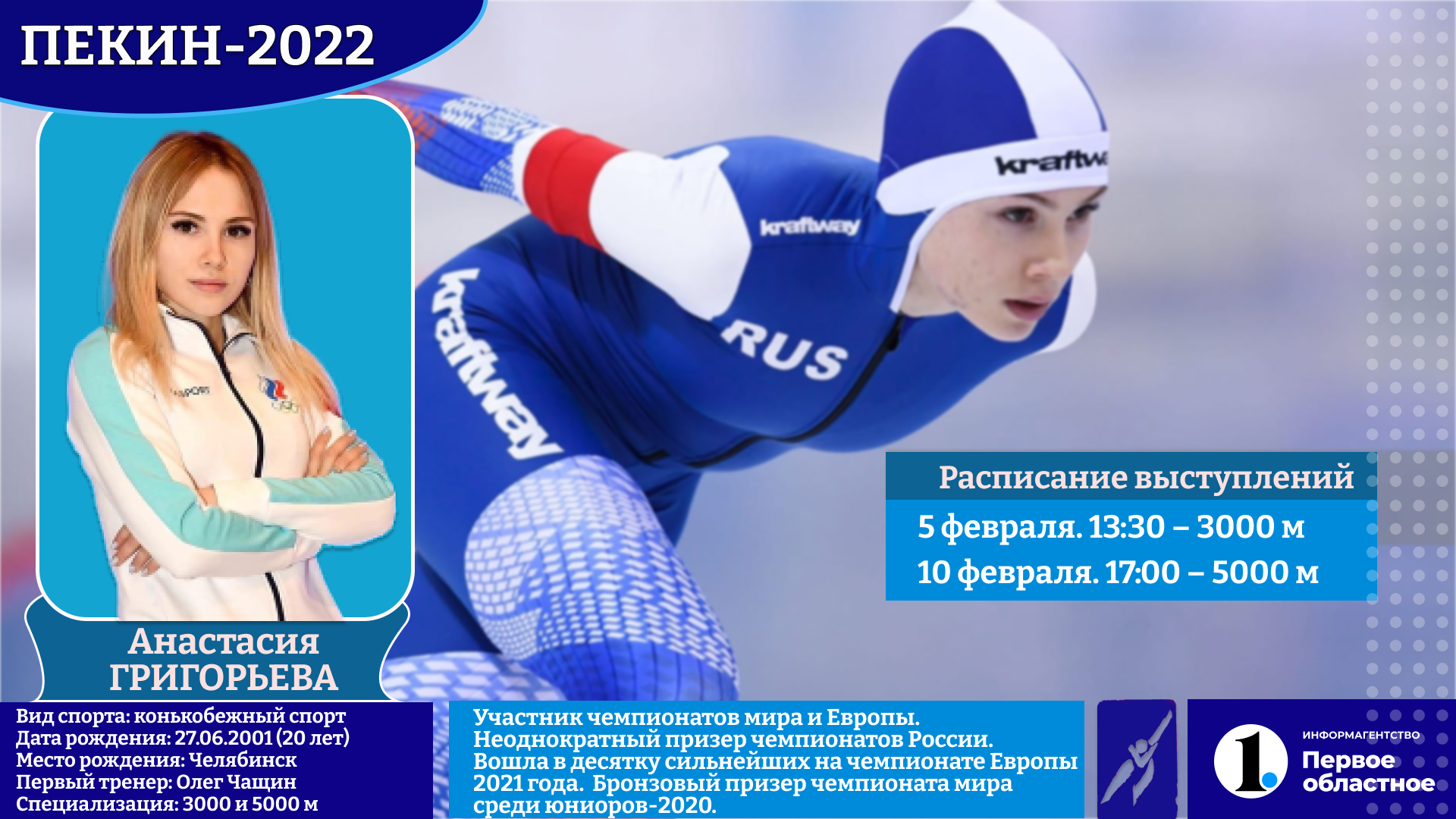 Будем переживать и болеть в Китае мы и за другую южноуральскую спортсменку. Анастасия Григорьева может выступить теоретически также на двух дистанциях — 1500 и 3000 метров. Однако рассчитывать на это вряд ли стоит. Для 20-летней спортсменки Олимпиада-2022 станет дебютной. В ее активе — место в десятке сильнейших на чемпионате Европы. В то же время на этапах Кубка мира челябинке не удается подняться на высокие места. Но предстоящие старты могут послужить для нее трамплином в мировую элиту. Поэтому и сам факт участия в них является неоспоримым достижением и опытом, который обязательно пригодится в будущем.