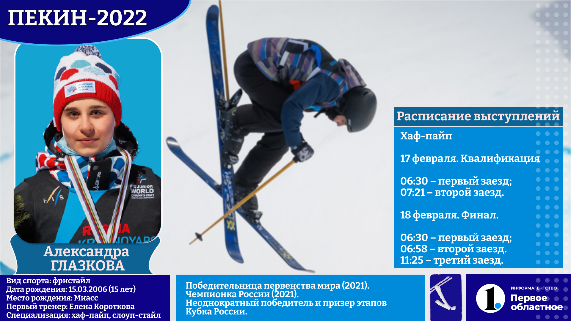 Что касается Александры Глазковой, то рассчитывать на высокий результат ей вряд ли стоит. На этой Олимпиаде спортсменка из Миасса будет одной из самых юных. Уже сам факт того, что 15-летняя фристайлистка пробилась на Игры в Пекин — несомненное достижение и удача. Победительница первенства мира прошлого года постарается доказать, что ее успех не случаен. Биться на равных с опытными и сильными соперницами в хаф-пайпе очень сложно, но наша спортсменка обязательно постарается дать им бой.