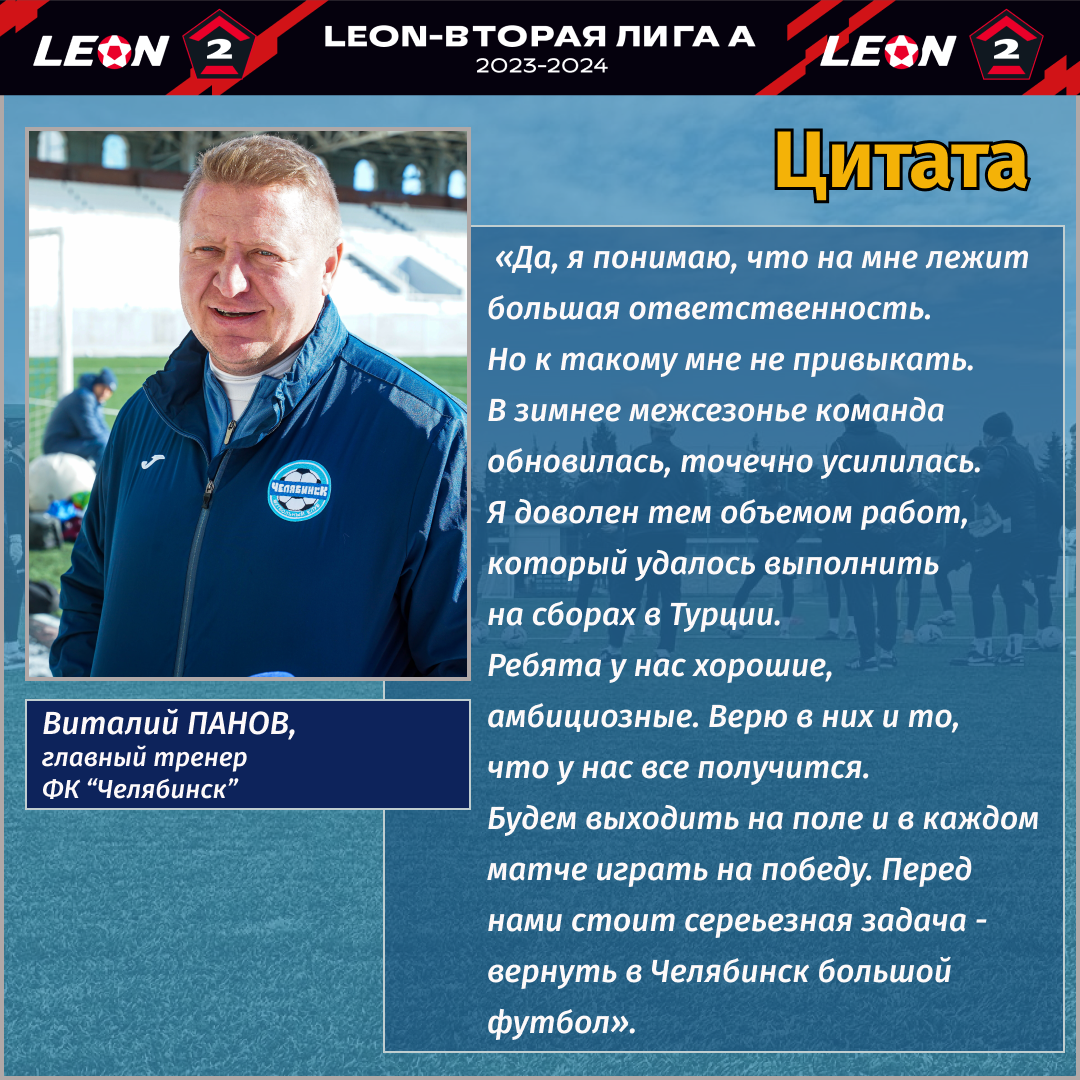 «Нас ждет непростой чемпионат. Все 10 команд дивизиона „Золотой“ ставят перед собой задачу выйти в Первую лигу. Мы не исключение. Да, задача сложная, но выполнимая. Радует, что футбол в Челябинске реально становится одним из приоритетных видов спорта. В регионе выстраивается вертикаль развития футбола в целом, начиная с детско-юношеского и заканчивая двумя профессиональными командами», — отметил директор ФК «Челябинск» Константин Арестов на открытой тренировке перед стартом чемпионата во Второй лиге А.