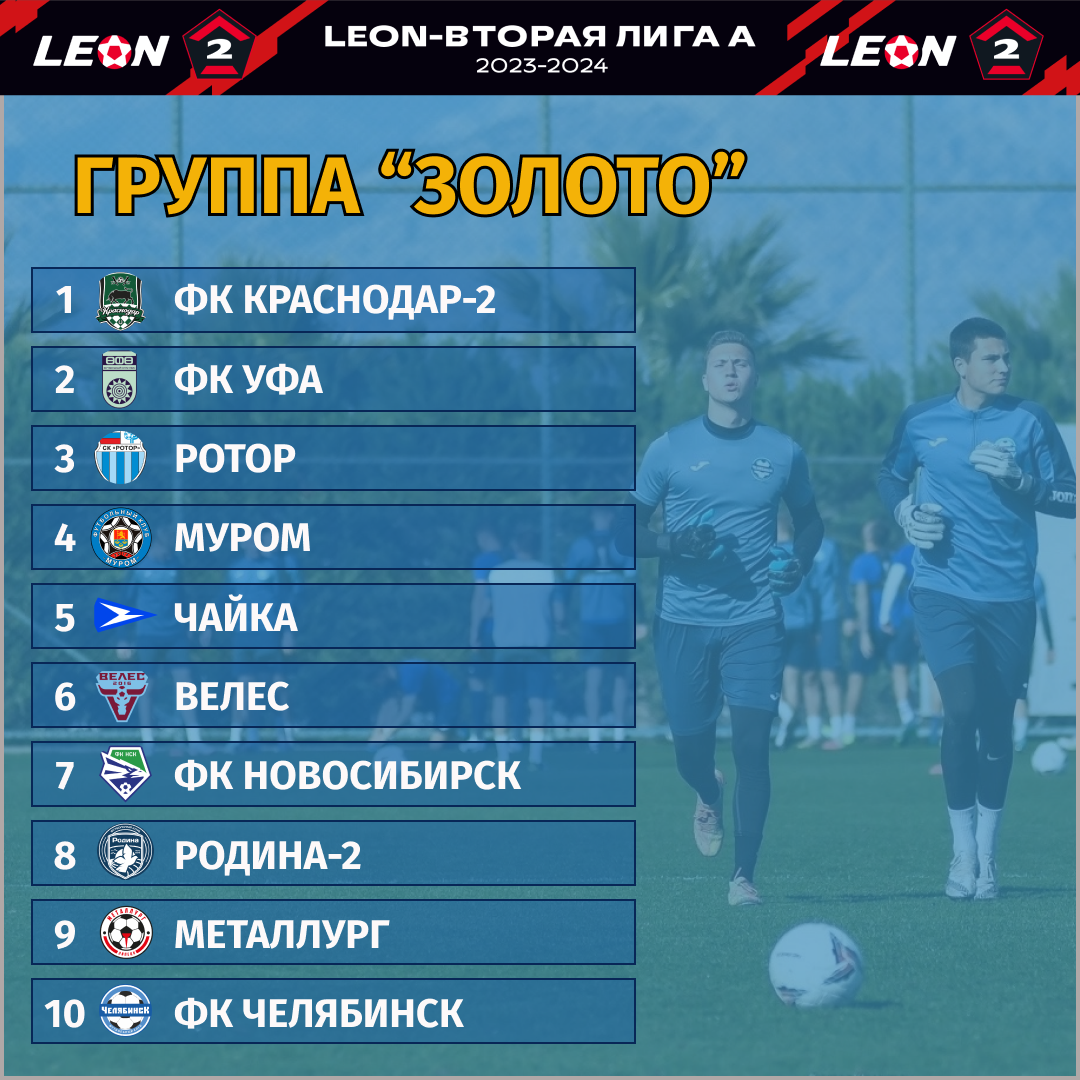 Как уже говорилось выше, в дивизионе «Золото» Второй лиги А все команды ставят перед собой амбициозные задачи и будут бороться за выход в Первую лигу. Конкуренция здесь сумасшедшая. И все-таки среди этих 10 команд можно выделить фаворитов. Очевидно, что будут бороться за высокие места «Ротор», «Уфа» и «Краснодар-2». Неплохие по составу игроки собрались в «Велесе» и «Новосибирске». Наверное, чуть меньше шансов быть в топе у «Чайки», «Мурома» и «Родины-2».