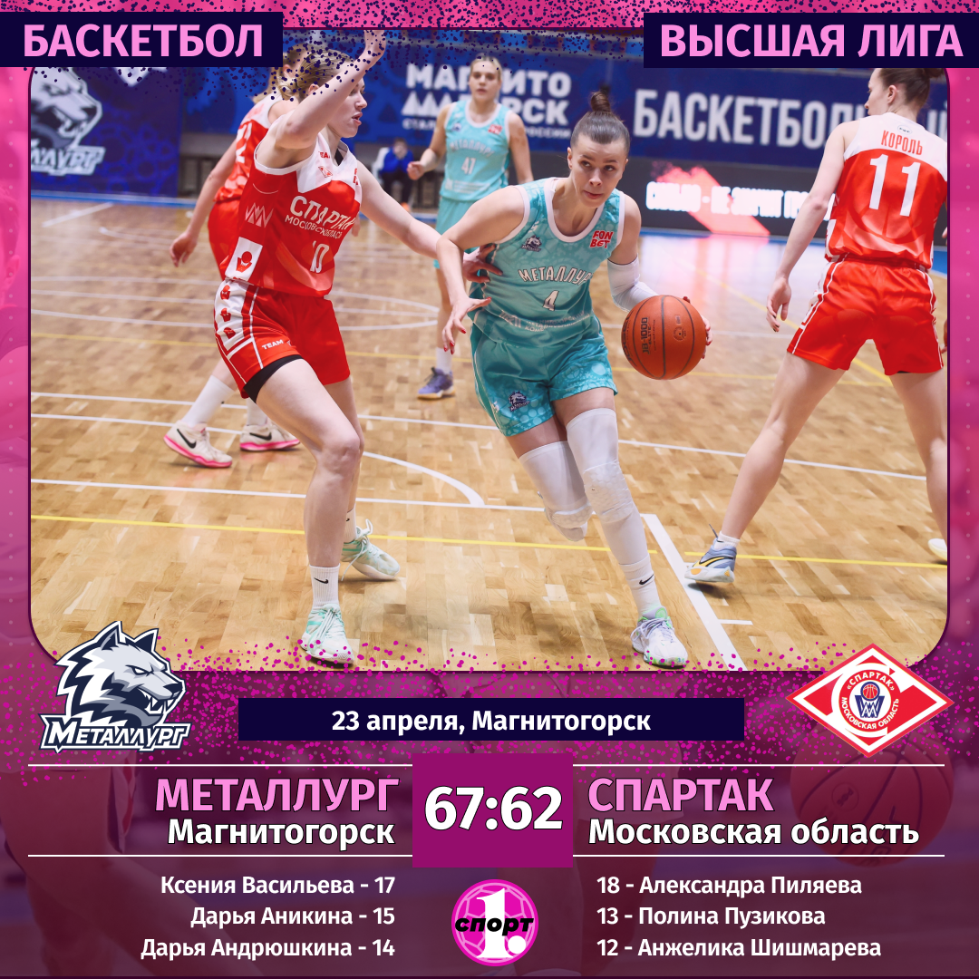 Баскетбол. Сезон-2025/2026. Высшая лига. Женщины. «Финал четырех» в Магнитогорске. Финал. 23 апреля. «Металлург» (Магнитогорск) — «Спартак» (Московская область) — 67:62 (26:20, 10:15, 19:14, 12:13).