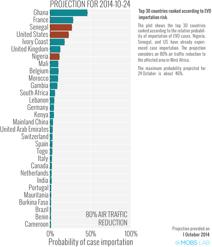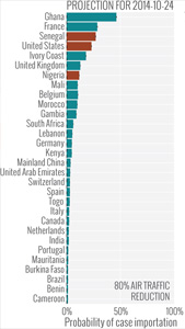 В группу риска входят 30 стран. Если тенденция сохранится, Эбола появится вначале в Гане, затем во Франции, крупные вспышки ожидаются в Сенегале, США и Нигерии, где уже зафиксированы случаи заболевания. Также модель подразумевает появления лихорадки в республике