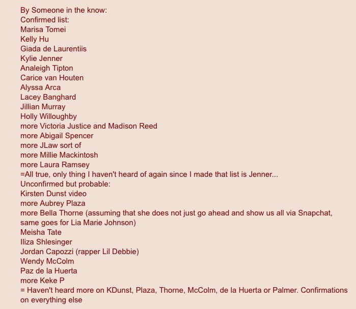 Также на The Fappening появился список с фамилиями актрис, чьи личные фотографии хакеры обещают опубликовать в ближайшее время. Среди них модель Кайли Дженнер, актрисы Кирстен Данст, Мариса Томей, Эбигейл Спенсер и Джиллиан Мюррей. — передает издание Tjournal.