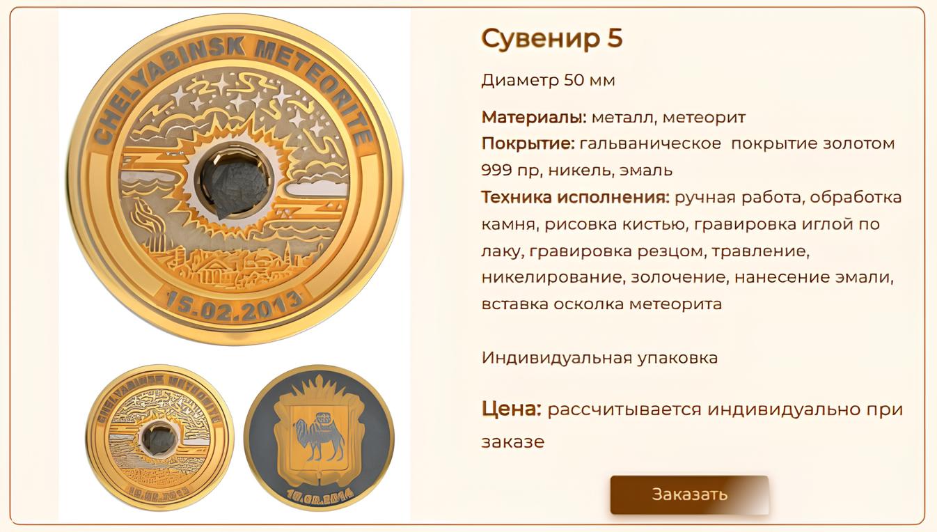 Кстати, медали, изготовленные южноуральскими оружейниками, стали героями на стенде Челябинской области на международной выставке-форуме «Россия» в Москве. Необычные награды обещали дарить гостям павильона. Андрей Чебаков рассказал, что после Олимпийских медалей кусочки метеорита еще оставались, а на сайте художественной мастерской выставлена позиция «Сувенир 5», изображающая ту самую памятную награду. Так что необычный сувенир может приобрести любой желающий. Вот только стоимость «золотого» метеорита, возможно, не каждому придется по душе.